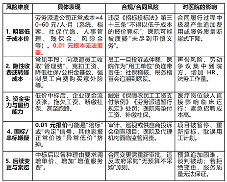 去年8月,写过《5元服务费的劳务派遣还是“劳务派遣”吗?》《5元服务费的劳务派遣还有服务吗?》两篇文章,引发全行业热议,大家普遍认为这是一个不可思议价格、难以接受的低价。现在看来,5元服务费还不是最低,今年又创新低了。最近,有同行介绍一个劳务派遣服务的招标案例,说中标单位服务费报价是0.01元/人月,也就是说劳务派遣服务费的价格已经“卷”到了每月每人1分钱。医院官网上查到了“采购公告”,“结果公告”还没有公布。但同行说这个数据是绝对准确的。如果这个信息是准确的,那我们就会联想到这个劳务派遣服务公司靠什么赚钱?是否能提供专业服务?劳务派遣公司和中标医院可能会有什么风险?
