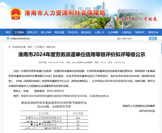 淮南市人力资源和社会保障局发布《淮南市2024 年度劳务派遣单位信用等级评价拟评等级公示》,安徽合心人才发展集团有限公司凭借规范的运营管理、优秀的信用资质,在全市劳务派遣单位信用评价中脱颖而出,拟评定为AAA 级(信用状况优秀) 信用等级。